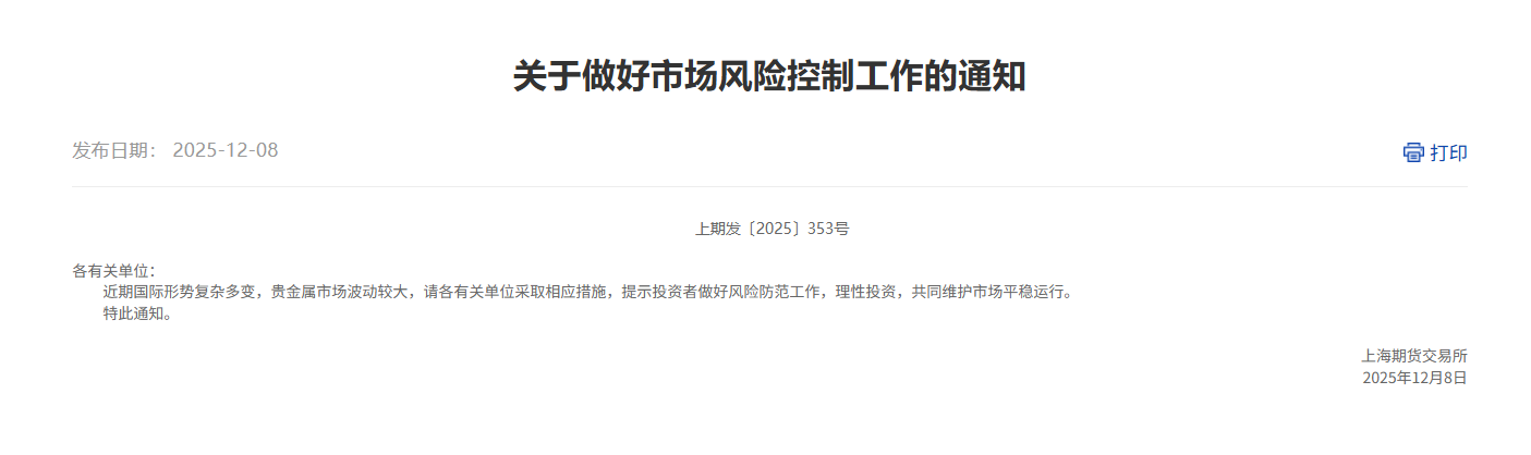 12月8日,上期所发布做好市场风险控制工作的通知,通知称,近期国际形势复杂多变,贵金属市场波动较大,请各有关单位采取相应措施,提示投资者做好风险防范工作,理性投资,共同维护市场平稳运行。