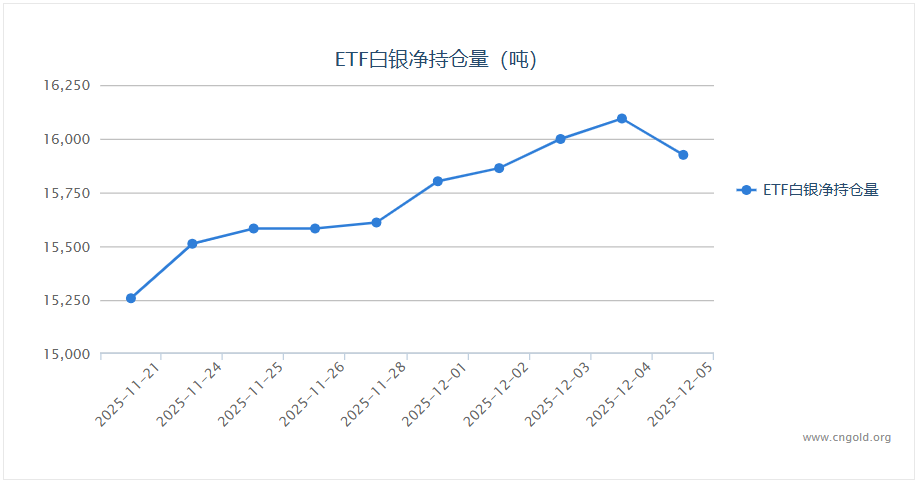 全球最大白银etf--iShares Silver Trust持仓报告显示,12月5日白银etf持有量为15925.21吨,较上一交易日减少169.24吨。上周五(12月5日)现货白银尾盘收于58.28美元/盎司,上涨2.07%,盘中白银价格最高上探至59.32美元/盎司,最低触及56.85美元/盎司。