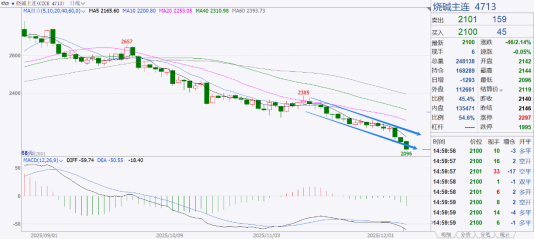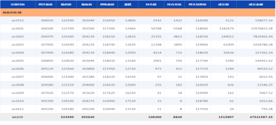 上周(2025.12.01-12.05),周一,价格窄幅震荡,为全周行情奠定基础;周二,盘中下探周内低点303500元/吨后企稳回升,多头试探性入场;周三,平开高走突破31万元关口,创阶段新高,市场做多情绪升温;周四,日内冲高回落,夜间窄幅震荡,多头开始获利了结;周五,开盘低开后弱势震荡,尾盘小幅收涨,高位盘整体征明显。