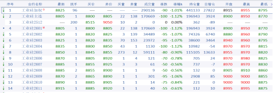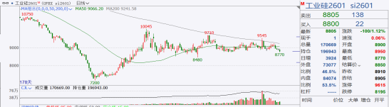 当周(2025.12.01-12.05)工业硅期货价格区间偏弱运行,呈现四阴一阳走势,截至周五收盘,工业硅(si2601)周度下跌325元/吨,收盘至8805元/吨,最高价9240元/吨,最低价8770元/吨,持仓19.7万手。