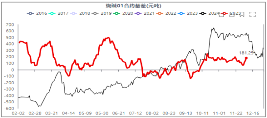 上周烧碱期货价格震荡下行,现货价格跟跌,基差增大,截至周五为181.75元/吨。