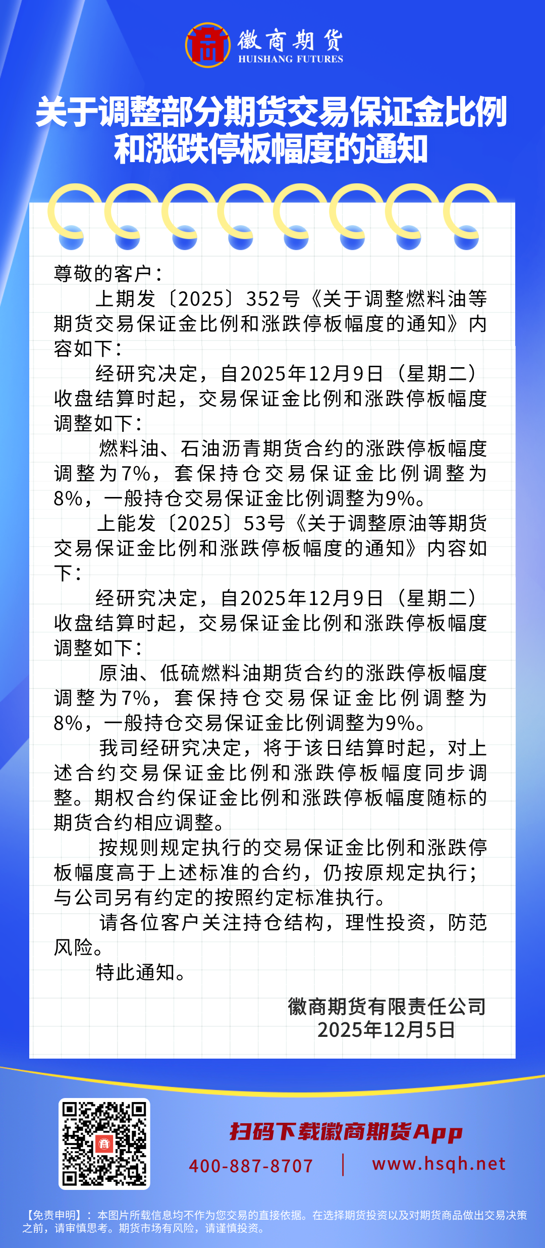 【交易提示】关于调整部分期货交易保证金比例和涨跌停板幅度的通知