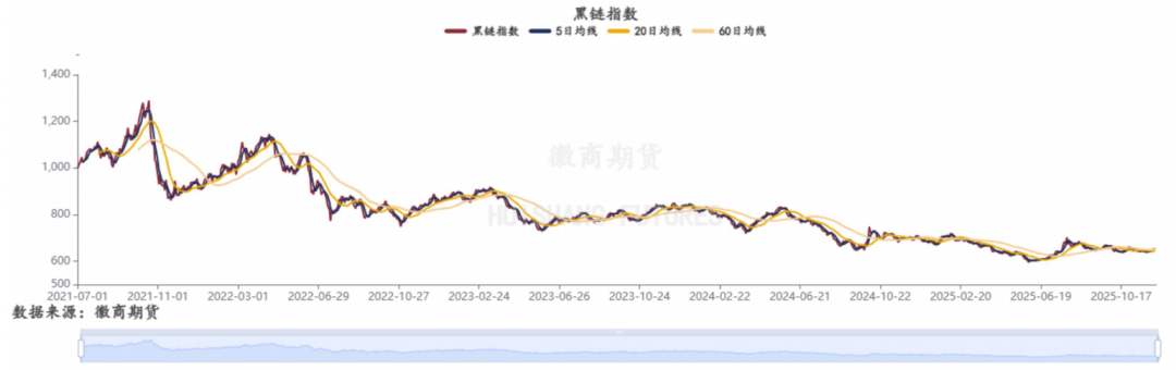 黒链指数上涨0.38%。黑色炉料:预计12月钢厂利润不足以支撑螺纹热卷产量大幅下降,铁水缓降至210-220万吨区间可能减速会放缓。钢材需求方面虽有部分制造业韧性支撑但终端整体按需采购,且建筑基建端随天气转冷工地停工、竣工现象将逐渐增加,需求转弱,因此成材自身上涨动力有限。长期尺度市场对铁矿普遍以过剩预期判断。但短期节前补库需求还完全没有兑现,且后期国内还有经纪工作会议,虽说市场对会议内容并未抱有乐观的期待,但相关政策的摇摆可能也会影响盘面波动。上周焦煤产量持续下降,但蒙煤通关量高企,下游冬储尚未启动,上游库存持续累积。当前基本面缺乏做多驱动(产量+进口量回升,上游库存累积,下游冬储补库暂未开启)。现货方面,在蒙5本轮下跌后,山西主焦煤开启补跌,关注补跌后现货价格企稳以及下游的采购意愿回升的时间点,对焦煤价格企稳来说是一个有效支撑。消息面,仍有关于供应端政策的不确定性,中央经济工作会议(12月11-12日)政策的方向是再提“反内卷”还是重申“保供”,这两种截然不同的风向,会给焦煤价格的上限和下限带来较大的分歧和空间。螺纹钢:钢材期货行情近期小幅收涨,但尚未形成明显的向上突破。当前市场的核心特征仍是供需双弱下的预期与现实的博弈。冬季淡季需求疲软的现实以及房地产等核心领域内需的不足,制约了钢材价格的上涨空间。但同时库存持续下降和宏观情绪回暖、以及钢厂限产为价格提供了重要支撑,使得短期价格存在反弹修复的动能。具体来看,企业盈利率继续下跌使得钢厂增产动能减弱,铁水产量在高位维持了较长一段时间之后终于有所下降,反映出钢厂生产强度现阶段的减弱,五大材产量也微幅下降,供给端的变化带来供需平衡的改善。需求端表现符合季节性特征,库存延续去化,尤其是热卷较高的库存也开始有所去库,形势正在出现边际变化,给市场带来一定信心。成本端方面,焦煤价格受保供应预期影响价格回落,但铁矿石受中品矿紧缺影响价格依然坚挺,当前成本支撑仍在。后市来看,短期内市场缺乏打破平衡的驱动因素,但12月份是年底的重要会议宏观政策窗口期,市场可能会交易利好预期因素带动行情氛围好转。同时,若供给端得到有效压减,也将为上涨注入新的动力。