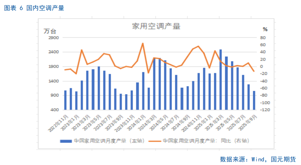 空调行业在2025年生产表现体现出明显的差异性。以旧换新国补拉动的普惠周期在年初依旧得以体现,后伴随空调生产淡季到来,空调产量自4月起持续回落,产业链整体产销策略逐渐趋于谨慎。