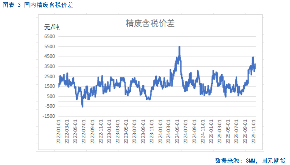 2025年精废含税价差多数时候维持在500-2500元/吨水平,精废价差变动主要跟随精铜盘面节奏运行。
