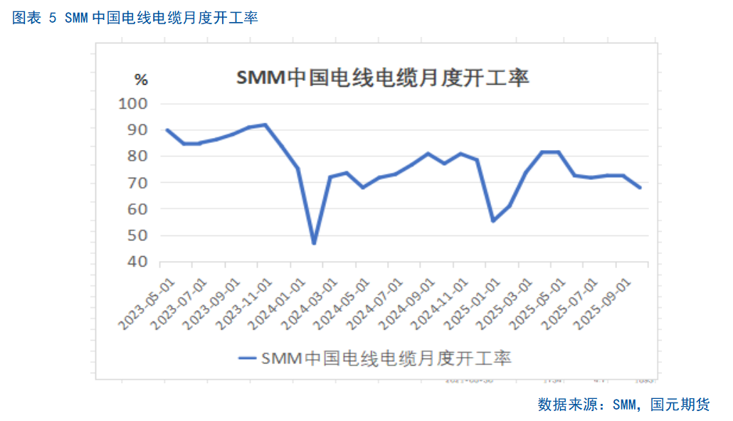 2025年国内线缆企业生产情况与往年存在一定差异性。受国内春节时间较早影响,线缆企业在1月生产力度偏弱,2月生产有明显提升,不同于往年2月开工率回调的常规节奏。美国“对等关税”令铜价在清明节前后明显受挫,对线缆企业形成明显利好,并带动线缆企业生产在二季度表现积极,并未体现出明显的季节性特征。