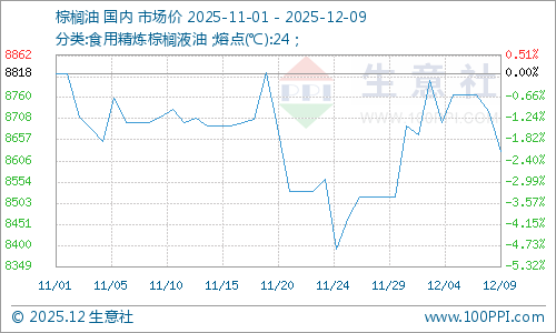 据生意社商品行情分析系统显示:11月开始,棕榈油行情持续走弱,行情振荡下跌为主,一直跌至12月初。11月1日,棕榈油市场均价8818元/吨,12月9日,棕榈油市场均价8628元/吨,价格下跌2.15%。