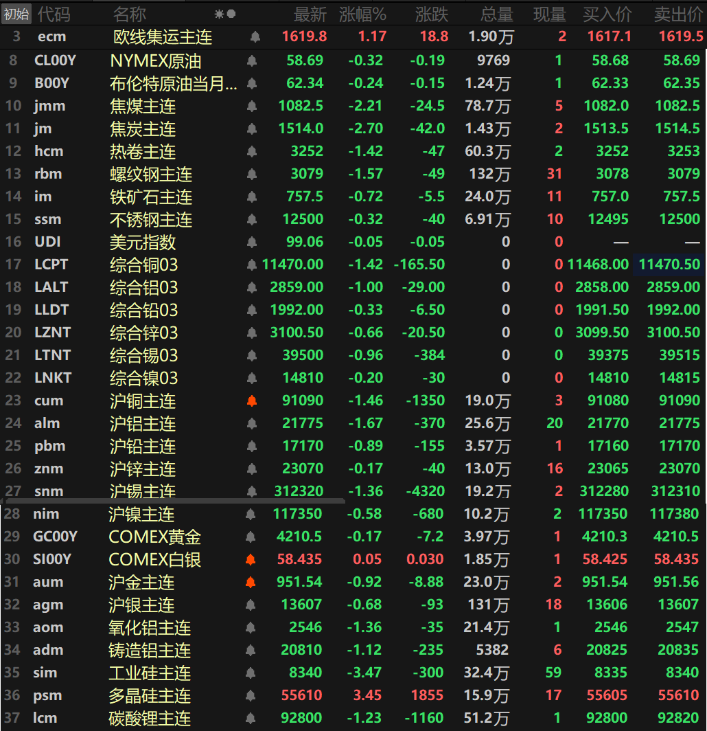 此外,碳酸锂主连跌1.23%,多晶硅主连涨3.45%,工业硅主连跌3.47%,录得五连跌。欧线集运主连涨1.17%报1619.8。