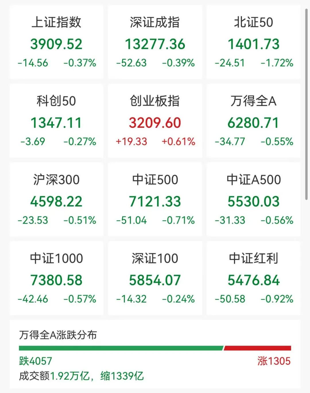 12月9日,沪指、深成指震荡回落,创业板指冲高回落尾盘拉升。截至收盘,沪指跌0.37%,深成指跌0.39%,创业板指涨0.61%。沪深两市成交额1.92万亿,较上一个交易日缩量1339亿。全市场超4000只个股下跌。