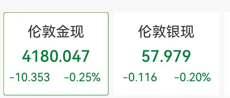 商品方面,金价银价短线下挫,现货黄金一度跌破4180美元关口。