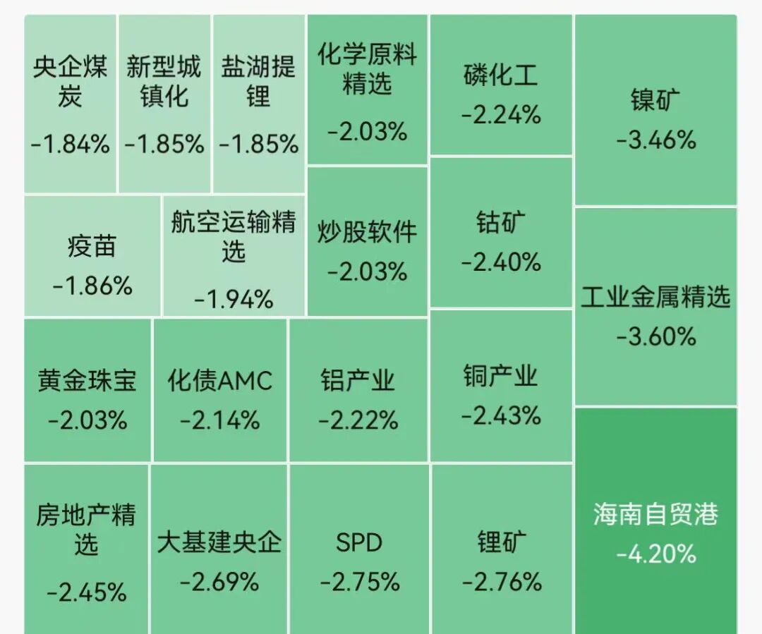 下跌方面,海南本地股集体大跌,新大洲A(000571)跌停。有色金属、黄金珠宝板块全线回调,铝业、黄金领跌,多股跌超5%。