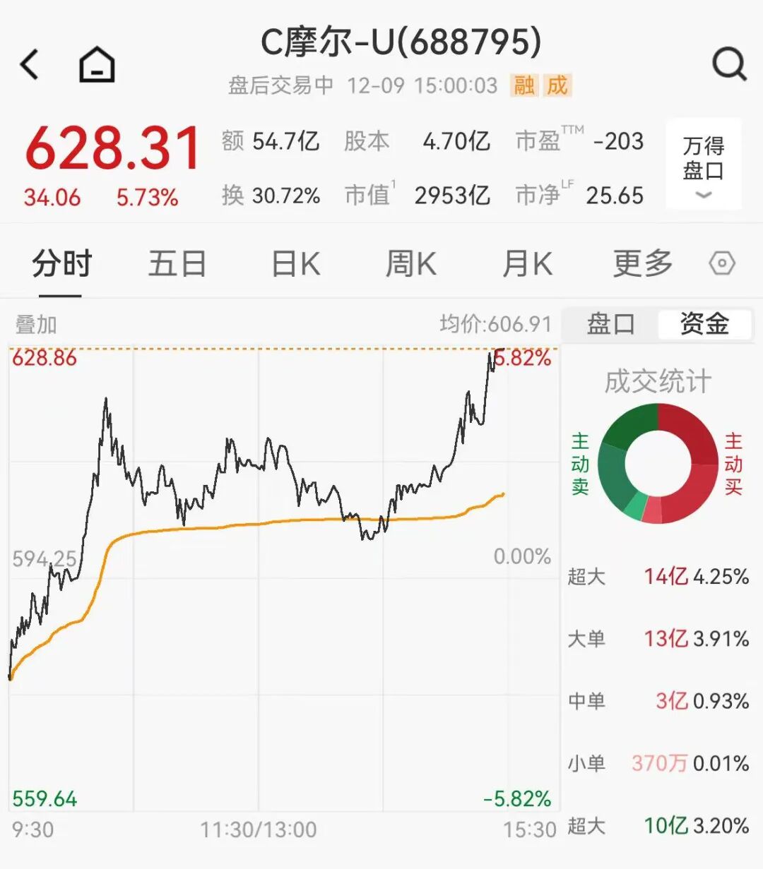 个股方面,摩尔线程尾盘快速拉升,截至收盘涨5.73%,报628.31元/股,市值报2953亿元。