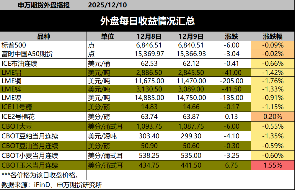 股指:美国三大指数涨跌不一,上一交易日股指回调,综合板块领涨,有色金属板块领跌,市场成交额1.92万亿元。资金方面,12月08日融资余额增加186.32亿元至24827.43亿元。2025年12月,全球金融市场将迎来两大“政策风向标”:美联储12月议息会议与中国中央经济工作会议,其中美联储议息策直接影响全球资本流向与风险偏好,而中央经济工作会议作为“十五五”规划开局前的关键部署会议,将明确中国2026年经济政策框架与产业发展方向。在国内经济温和复苏、全球流动性宽松预期升温的背景下,两大会议的政策共振,将影响12月A股节奏,更将为跨年行情与2026年投资主线奠定基础。整体上我们认为在两大会议政策正式落地前,资金可能更偏谨慎,股市预计仍然偏震荡为主,资金偏向防御性配置。待会议内容明确,积极政策信号与美联储降息形成共振,市场风险偏好有望再度提升。