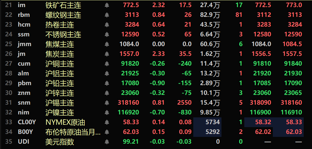 黑色系多飘红,铁矿涨2.32%,螺纹涨0.84%,热卷涨0.64%,不锈钢涨0.52%。双焦方面:焦煤主力合约平于1084元/吨,焦炭主力合约涨2.33%。