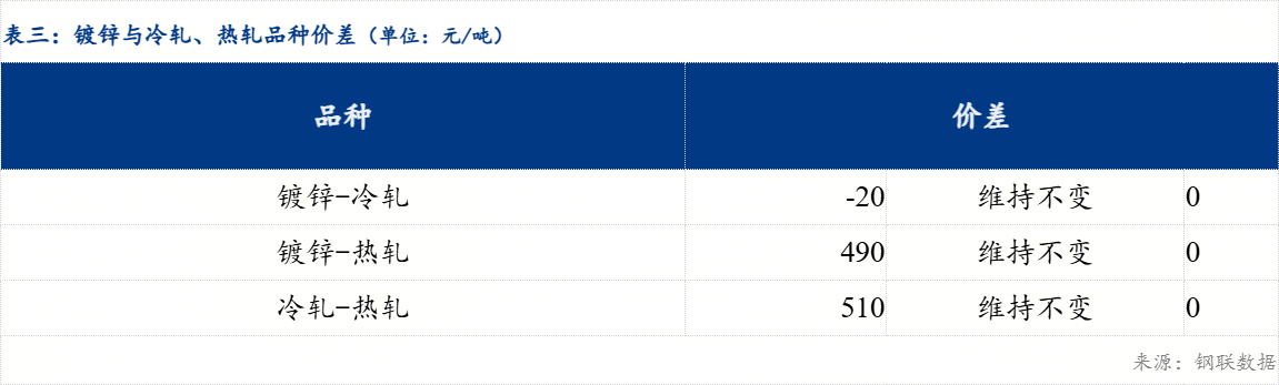 重庆、上海地区冷轧板卷区域价差维持不变0元/吨;重庆、广州冷轧板卷区域价差正向缩小20元/吨。重庆、上海镀锌板卷区域价差维持不变0元/吨;重庆、广州镀锌板卷区域价差维持不变0元/吨。镀锌、冷轧品种价差维持不变0元/吨;镀锌、热轧品种价差维持不变0元/吨;冷轧、热轧品种价差维持不变0元/吨。
