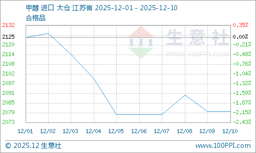 12月上旬原料甲醇行情弱势下行。截止10日,国内市场均价在2080.00元/吨,与12月1日价格2125.00元/吨相比跌幅2.12%。12月甲醇到港量增加,港口市场供应充足,内地甲醇开工率预期看涨,现货供应压力较大,同时下游库存偏高,入市采买氛围偏淡,甲醇企业出货欠佳,甲醇市场偏弱运行。