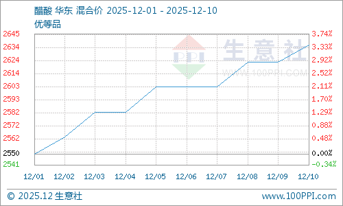 据生意社商品行情分析系统,截止12月10日,醋酸市场均价在2636.67元/吨,与12月1日价格2550.00元/吨相比,上调86.67元/吨,涨幅3.40%。12月上旬国内醋酸行情持续上涨。供应方面,部分检修装置重启推迟,同时新增企业装置检修,醋酸开工率下降,市场现货供应量减少,企业库存不断走低,场内挺涨氛围浓厚,下游方面表现平稳,入市按需跟进,市场供方支撑强劲,醋酸价格走势强势上行。