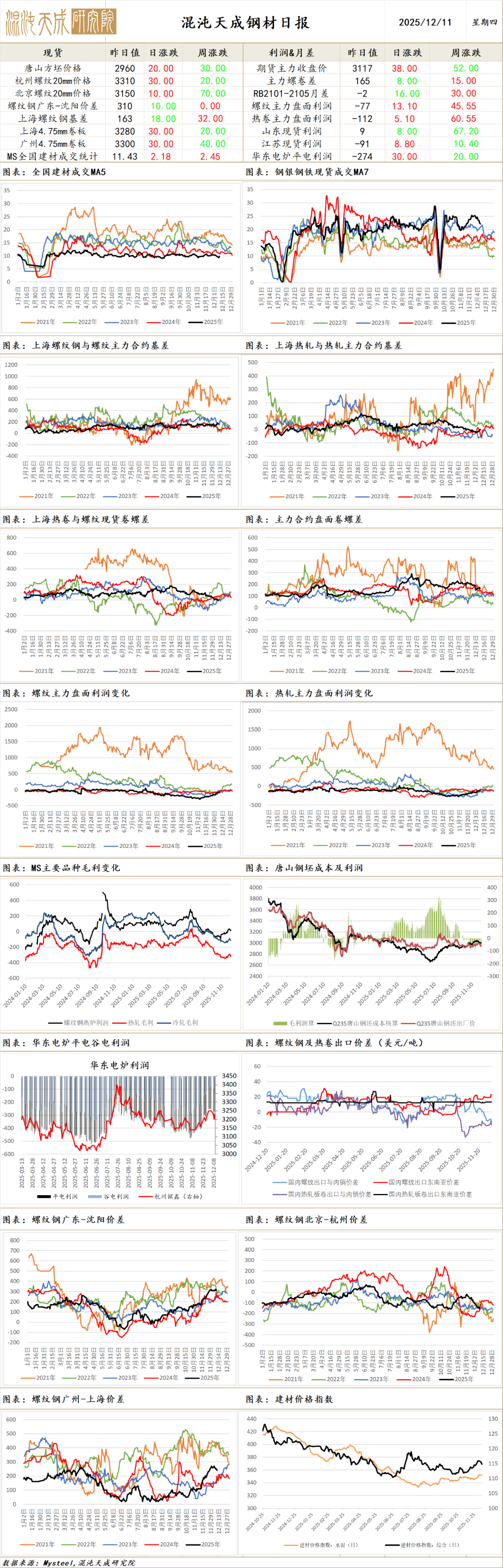 1.Mysteel10日调研结果显示:本周唐山主流样本钢厂平均铁水不含税成本为2304元/吨,平均钢坯含税成本3065元/吨,周环比下调6元/吨,与12月10日当前普方坯出厂价格2940元/吨相比,钢厂平均亏损125元/吨,周环比增加44元/吨吨。
