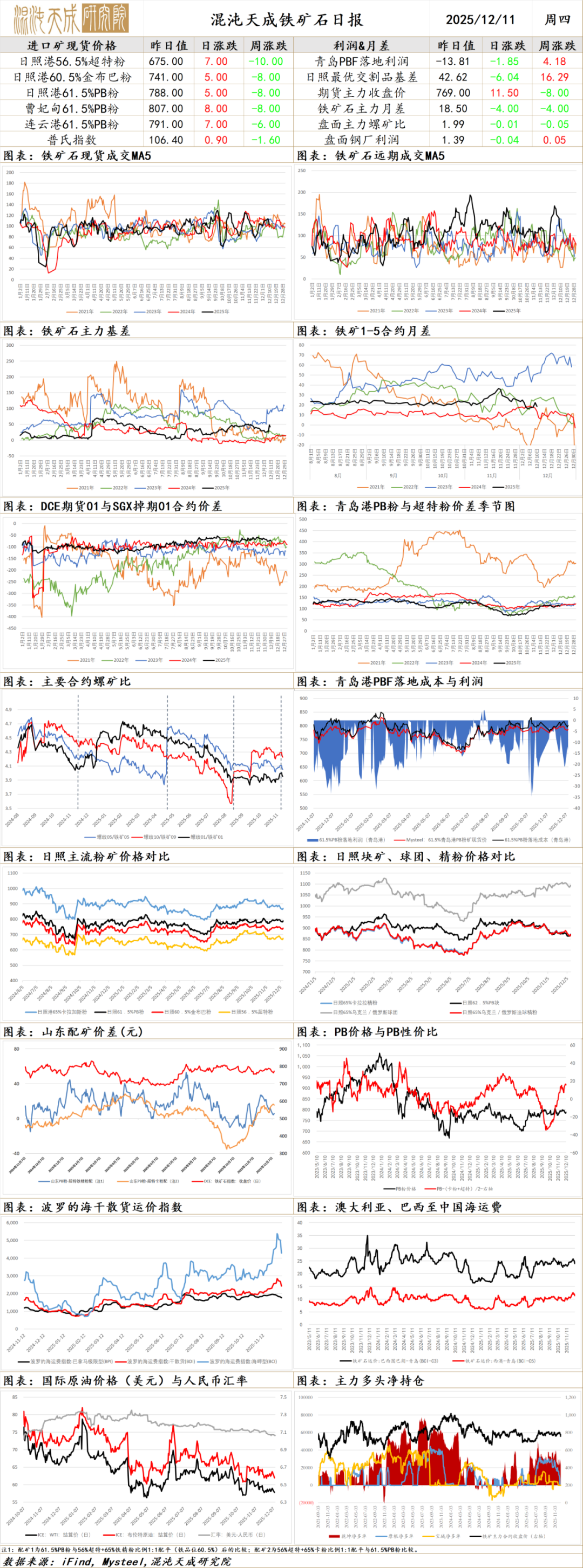 需求端,SMM最新调研显示本周高炉检修继续增加,铁水产量延续下降。上周钢联高炉开工率继续小幅减少,日均铁水降幅扩大2.38万吨至232.3万吨,同期钢厂盈利率略有回升至36.36%。此外,钢厂铁矿库存也有小幅增加,因进口矿日耗大幅下降,钢厂进口矿库销比略有回升。随着年末钢厂检修增多,对铁矿仍将维持按需采购。昨日铁矿港口现货及远期美元货成交均有回落,目前PB粉落地亏损小幅扩大,显示国外需求仍强于国内。