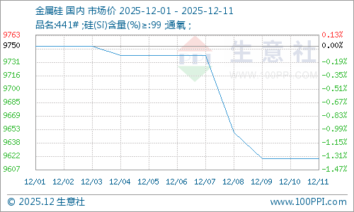 根据生意社行情监测系统分析显示,12月11日,国内金属硅#441市场价格参考9620元/吨,与12月1日(金属硅#441市场价格9750元/吨),价格下调130元/吨,跌幅1.33%。