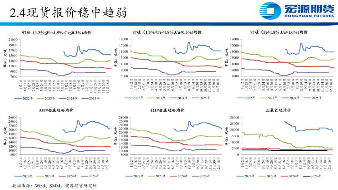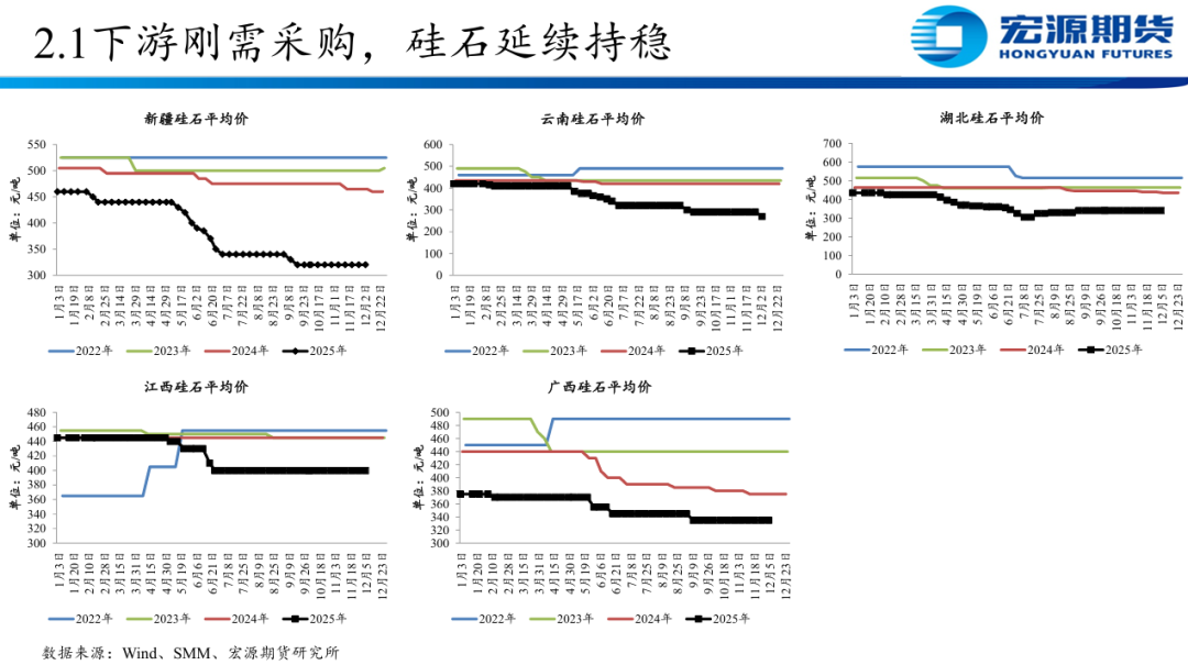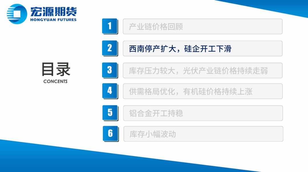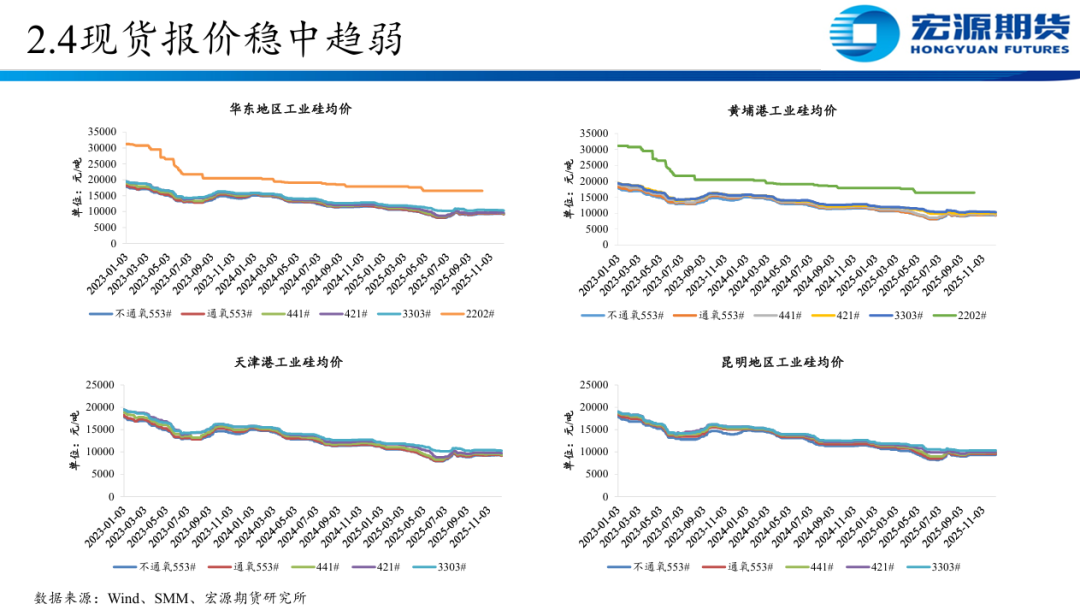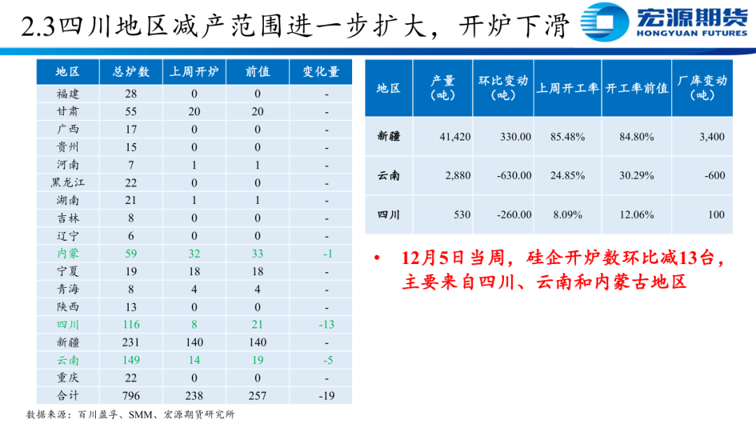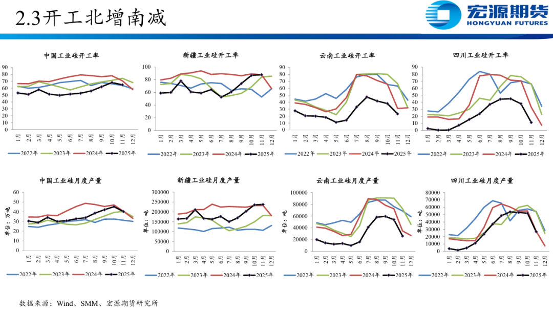 供给端::西南产区已基本处于枯水期,开工处于年内低位,随 着四川地区进入枯水期,电力成本继续抬升,厂家生产压力较 大,开炉数明显下滑;西北地区开工基本稳定,产量平稳,其 他地区开工暂无明显变动。供给端整体呈现缩量趋势,预计12 月维持在40万吨左右,与往年同期基本持平,后续关注环保因 素对硅企开工影响。