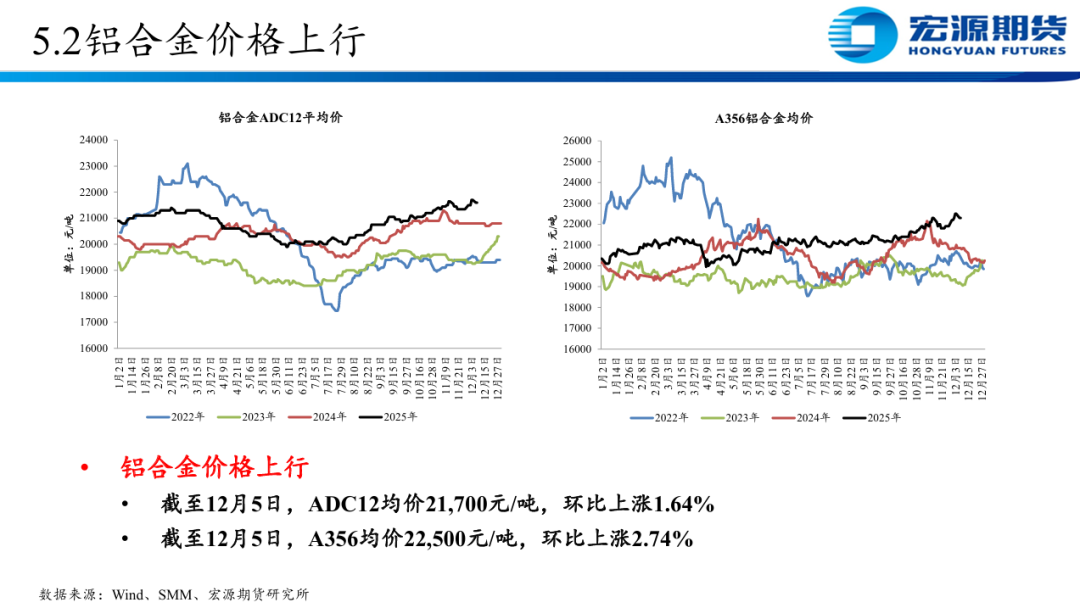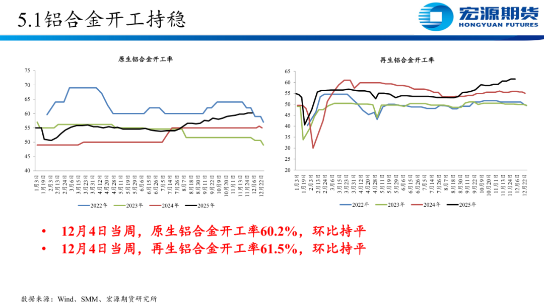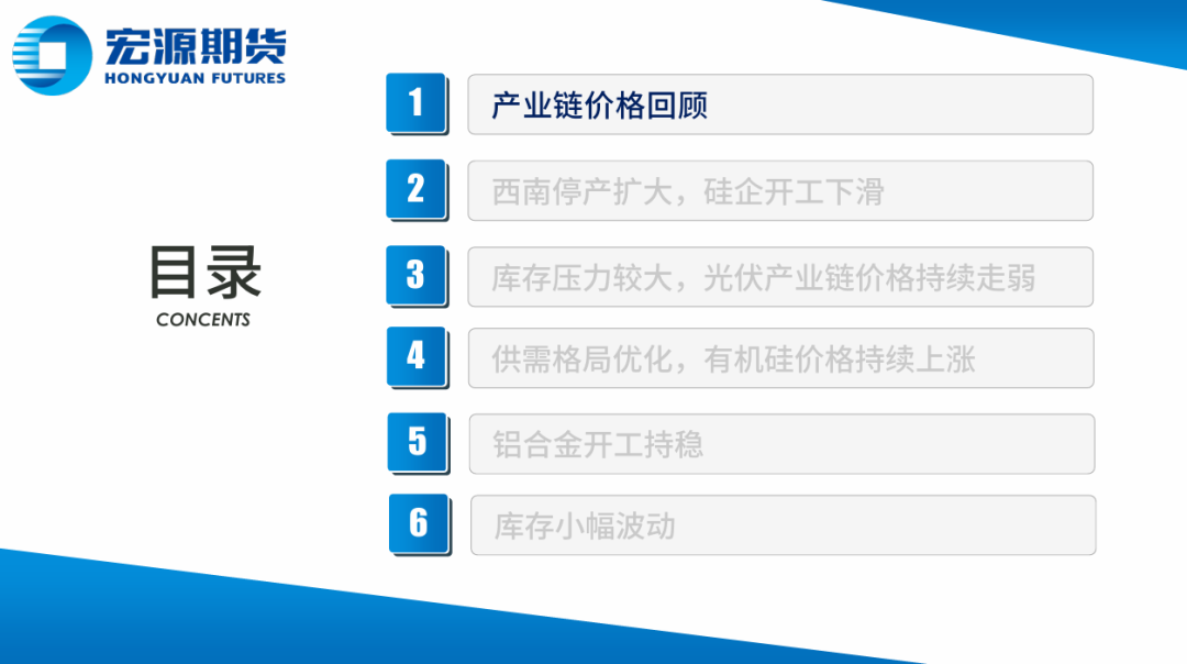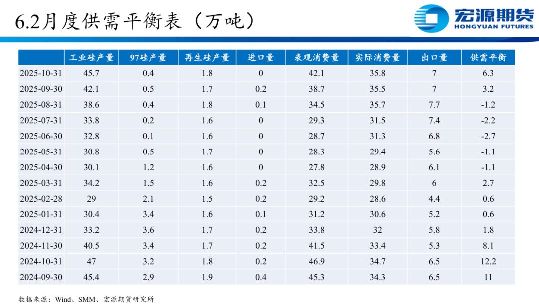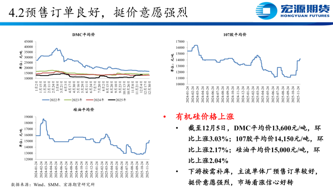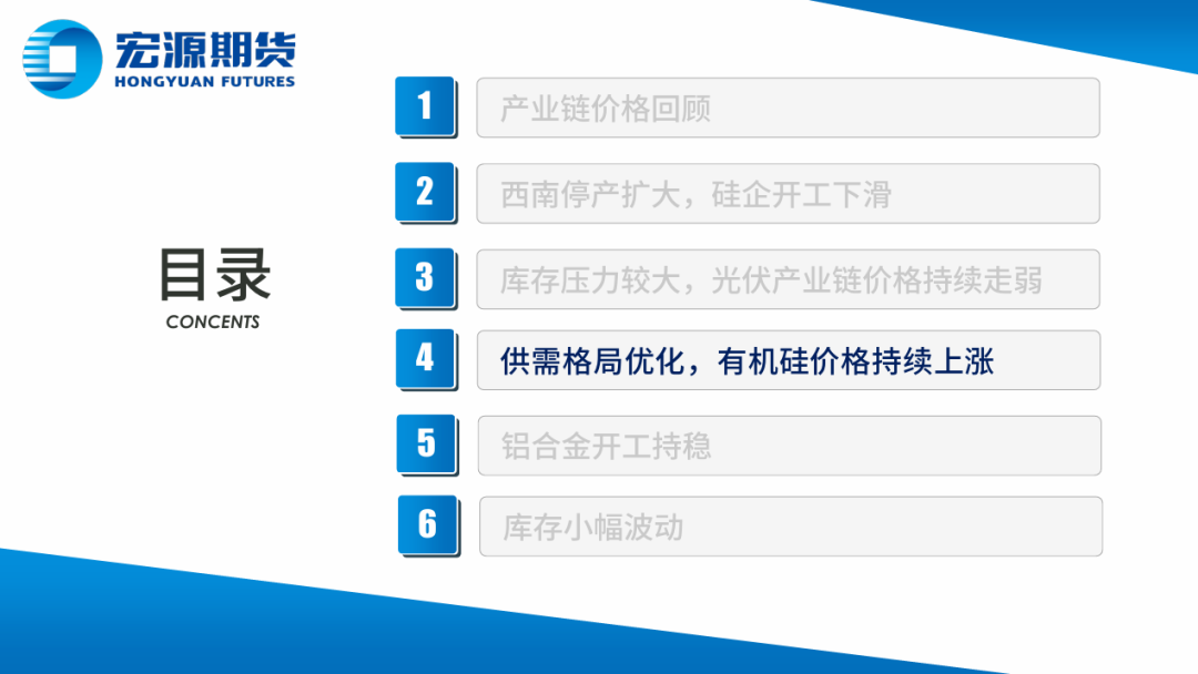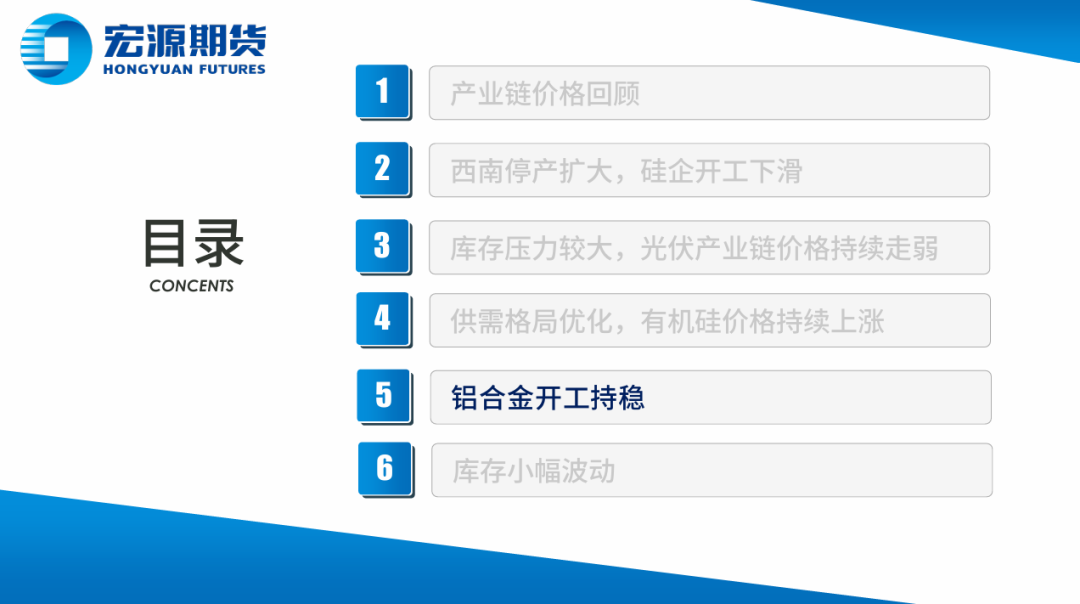 供给端::西南产区已基本处于枯水期,开工处于年内低位,随 着四川地区进入枯水期,电力成本继续抬升,厂家生产压力较 大,开炉数明显下滑;西北地区开工基本稳定,产量平稳,其 他地区开工暂无明显变动。供给端整体呈现缩量趋势,预计12 月维持在40万吨左右,与往年同期基本持平,后续关注环保因 素对硅企开工影响。