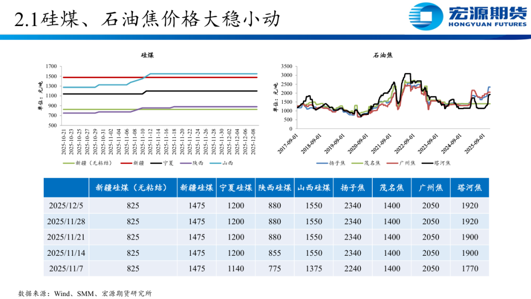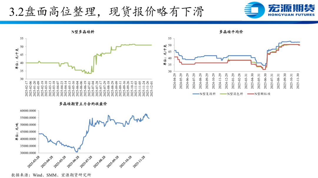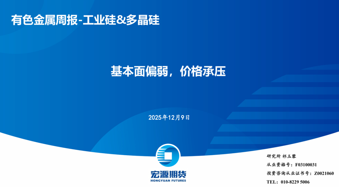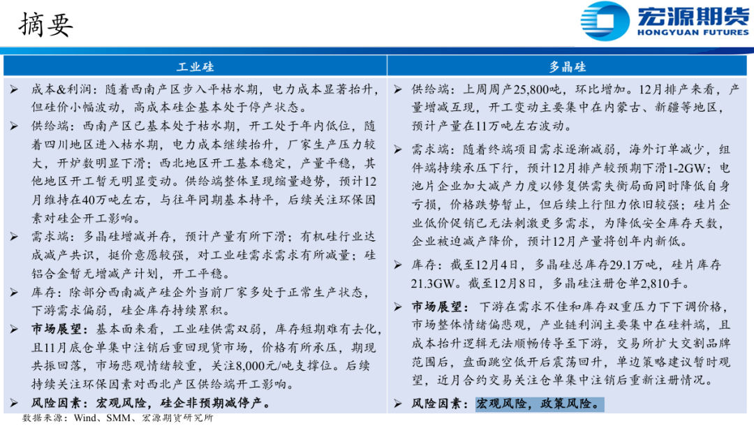 工业硅方面:基本面来看,工业硅供需双弱,库存短期难有去化, 且11月底仓单集中注销后重回现货市场,价格有所承压,期现 共振回落,市场悲观情绪较重,关注8,000元/吨支撑位。后续 持续关注环保因素对西北产区供给端开工影响。