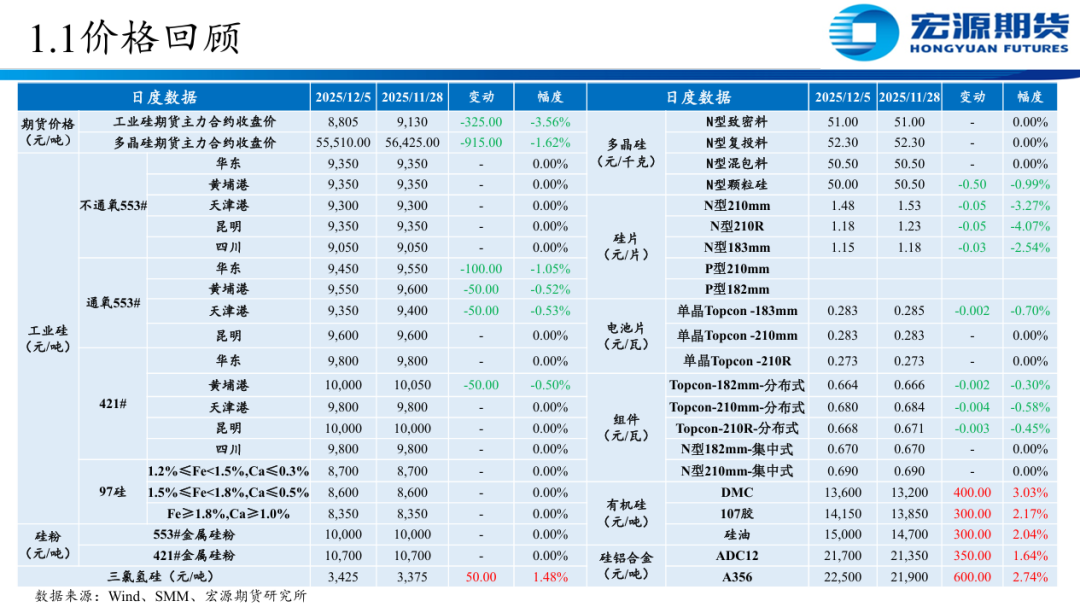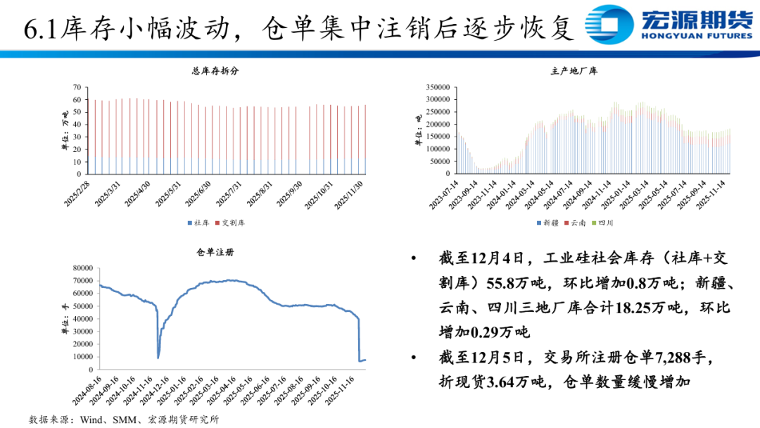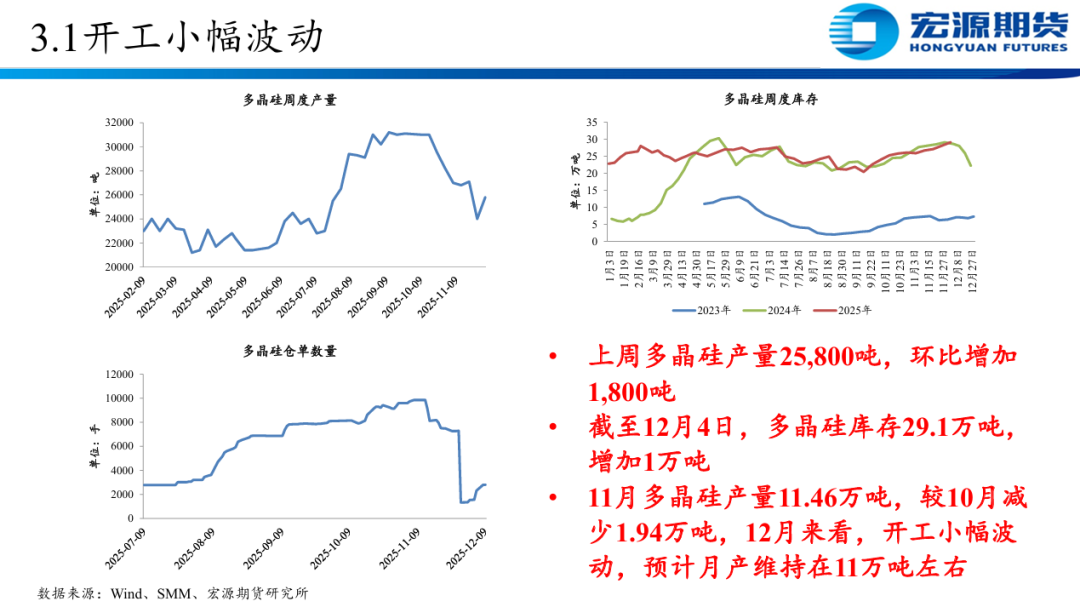 库存:截至12月4日,多晶硅总库存29.1万吨,硅片库存 21.3GW。截至12月8日,多晶硅注册仓单2,810手。