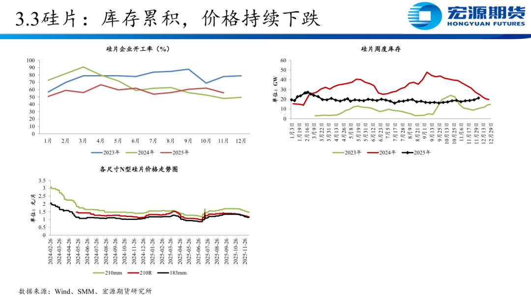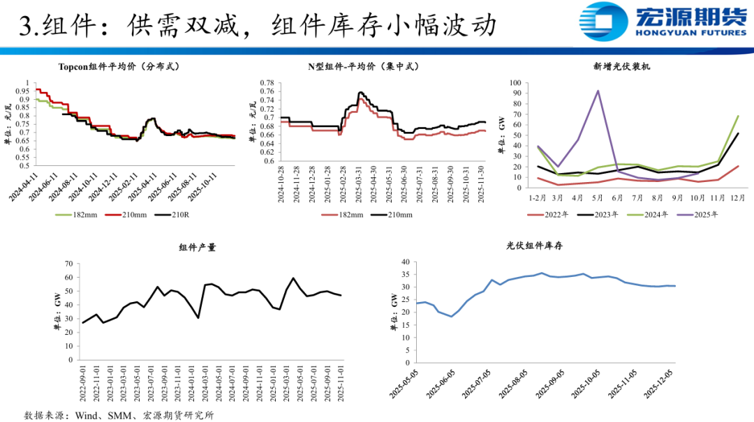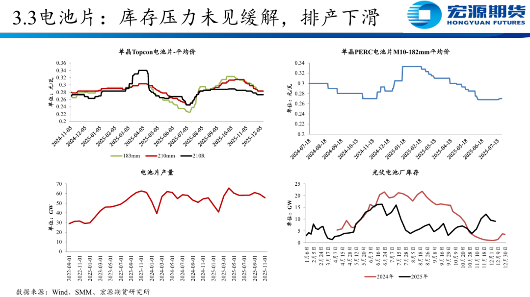 需求端:随着终端项目需求逐渐减弱,海外订单减少,组 件端持续承压下行,预计12月排产较预期下滑1-2GW;电 池片企业加大减产力度以修复供需失衡局面同时降低自身 亏损,价格跌势暂止,但后续上行阻力依旧较强;硅片企 业低价促销已无法刺激更多需求,为降低安全库存天数, 企业被迫减产降价,预计12月产量将创年内新低。