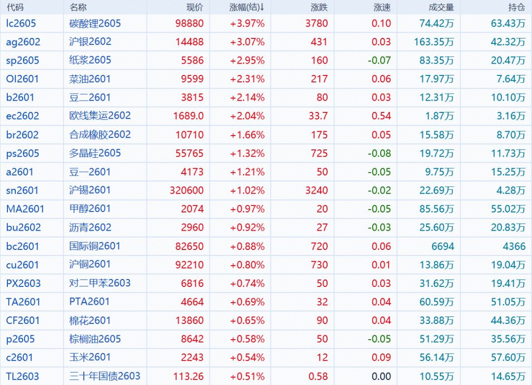 12月11日,午市收盘,国内期货主力合约涨跌不一,碳酸锂、沪银涨超3%,纸浆、菜油、豆二、集运欧线涨超2%,BR橡胶、多晶硅、豆一、沪锡涨超1%。跌幅方面,焦煤跌超4%,焦炭、烧碱、乙二醇、跌超2%,燃料油、PVC跌近2%。