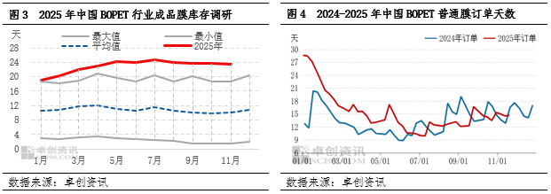 需求端看,下游提货速度尚可,此现象从十一假期后延续至12月初,新单维持刚需采购,个别时间择低补货增多,生产端订单周期震荡延长。11-12月BOPET价格延续涨势,下游在12月初集中补货,订单延长明显。订单周期来看,12月订单周期延长至17天附近,处于年内中等偏上水平,较7月份低位延长7天左右,对市场形成正向反馈。随着膜价上涨,市场前期低价合同消耗速度进一步加快,叠加十一以后下游提货速率尚可以及生产端因新增投产生产不稳定与部分产线转产薄光产品,产量略减少,推动生产端成品库存缓慢下降,11月底下降至23.52天,较7月底库存高位下滑1天以上。订单增多,库存下滑,供需矛盾有所缓解,推动市场价格延续上涨。值得注意的一点是,库存当前仍然处于历史五年同期高位,对市场仍形成一定的向下压制,但是从7月底至12月初,库存水平在持续下滑,虽然幅度有限,但也是反馈市场向好的积极信号。