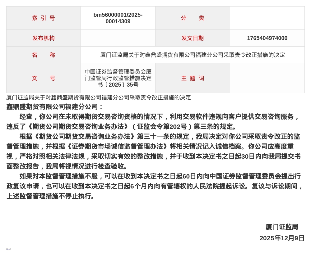 鑫鼎盛期货福建分公司被责令改正,涉交易咨询服务违规