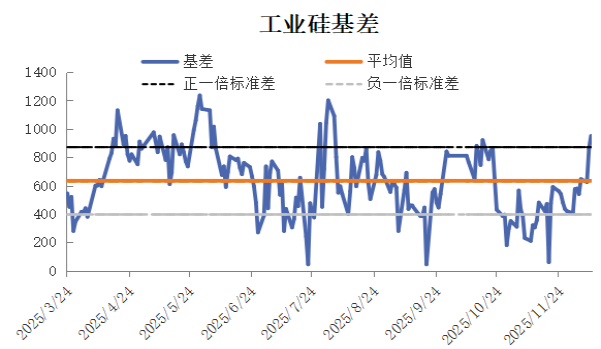12月10日,工业硅2601期货合约报价8250元/吨,现货报价9200元/吨,基差950元/吨,基差率超过10%,达到11.52%。