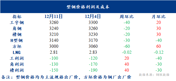 唐山型钢价格小幅趋弱运行,工字钢、角钢、槽钢、H型钢价格较上周下跌20-40元/吨,钢坯价格较上周下调60元/吨,LNG价格持较上周小幅下降,调坯轧钢厂理论利润仍处亏损状态。