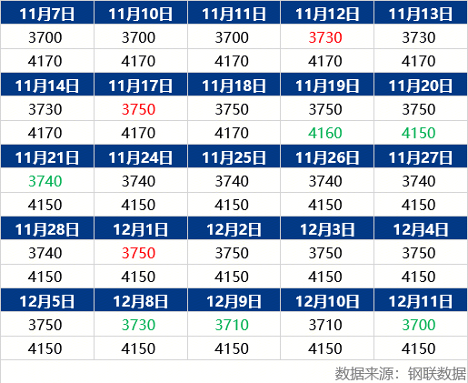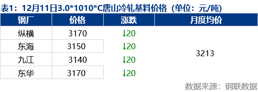 截止12月11日17:30,1.0mm冷轧板卷月均价3736元/吨,1.0mm镀锌板卷月均价为4156元/吨。