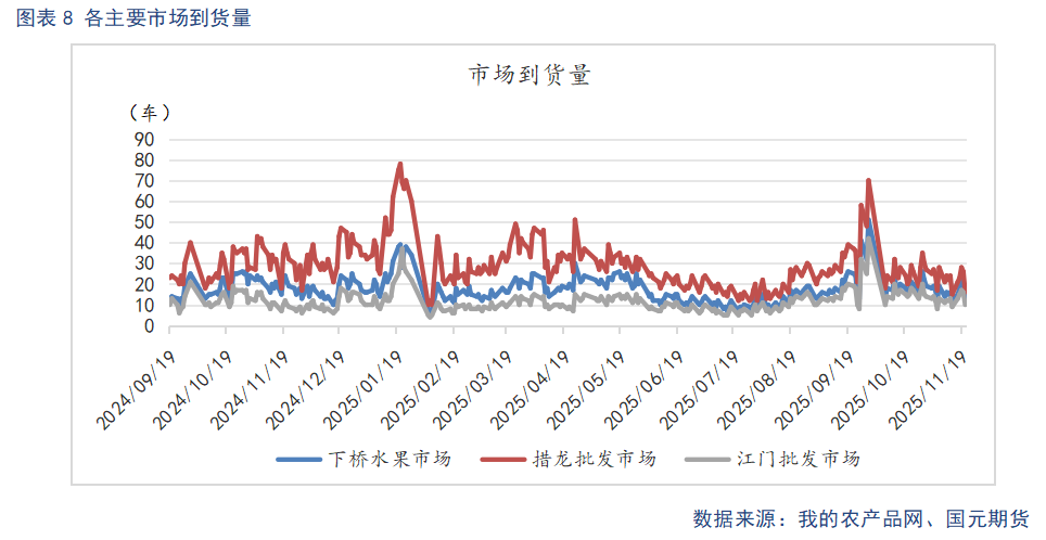 25/26果季入库工作结束后,全年供给基本可以确定,影响市场的主要因素还是在消费端。从新季的销售情况来看,截止2025年11月21日,广东三大批发市场日均到车量13车,较2024年同期下降9车。由于25/26果季呈现“价高质低”,加之应季大宗水果冲击,显得性价比偏低,下游按需拿货,走货偏慢。终端对高价果接受程度有限,现阶段压制本季果价继续大幅抬升,尤其是库存占比较大的中等及偏差货源,在春节期间面临较大销售压力,以质论价情况将越发明显,有降价走量的预期,将拖累苹果整体价格上行动力。不过好货价格将维持高位,待后续一般货源大量消耗,优果溢价将成为果季中后期支撑价格的重要因素。
