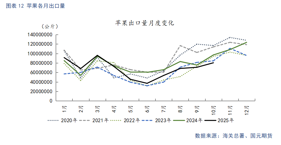 我国出口的主要目的地是东南亚、南亚地区。其中越南、菲律宾、孟加拉国、泰国、印度尼西亚是我国苹果前五进口国。据海关总署数据显示,2025年1-10月,我国苹果累计出口量为68.4万吨,同比减少8.68%。我国苹果出口的传统旺季集中在每年四季度至次年一季度。24/25果季开秤价较低,保持了价格优势,25年1-3月份。出口同比大幅增加。进入4月后,经过前期持续出库,冷库剩余库存量已明显减少,可供出口的货源相对有限。加之低库存支撑下,苹果价格明显上涨,出口竞争力有所削弱。苹果出口呈现明显回落态势,并在6月跌至历史偏低水平。7月后,早熟陆续上市,出口环比大幅恢复,但整体仍远低于去年同期水平。10月新季晚熟下树后,商品率偏低,供应国内市场的好货偏紧,而适合出口的中小果货源供应较为充足。四季度是传统出口旺季,出口量延续环比增加势头。本季上市期推迟,供给相对紧张,出口环比增长,同比仍有下滑。不过随着东南亚家庭小型化趋势,以及国际贸易争端下,我国和东南亚经贸关系越发密切,中小果出口潜力较大。