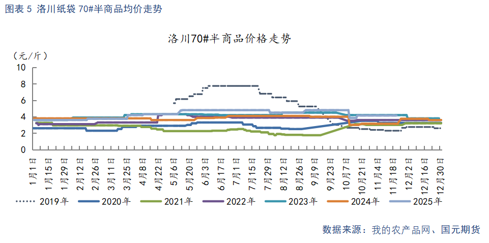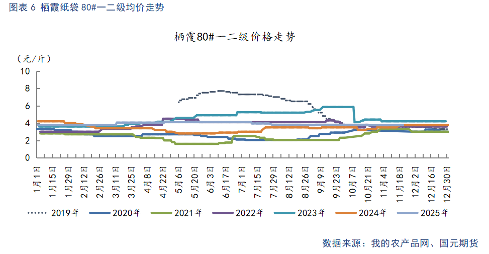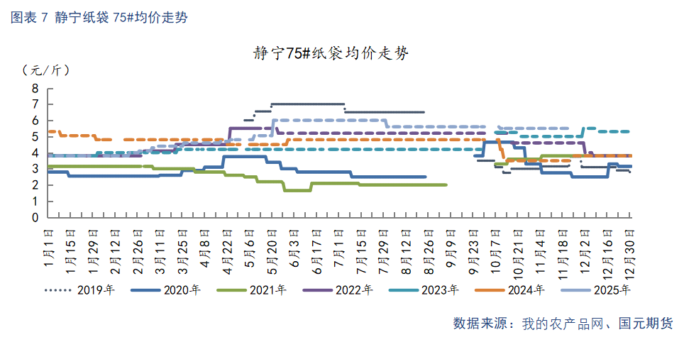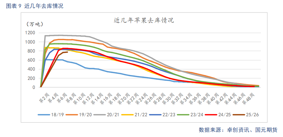 25/26果季在生长期受产区气候影响,当季产量小幅下降,叠加商品率下滑幅度较大,好货占比较小,溢价效应明显,收购价整体高于去年同期。而9月底的连阴雨天气又对收购、入库进度造成迟滞,导致本季入库量低于去年同期,处于近几年偏低位,且库存质量不佳,形成库存货源“量质双低”的局面。而需求端未表现出根本性改善,尤其本季果价偏高,质量普遍偏差,在梨、柑橘等秋冬季大宗水果集中上市的冲击下,显得性价比不高,终端走货略显缓慢。综合来看,供应端好货偏紧的格局,支撑交割成本高企,25/26果季基本面偏强为主基调。而需求端在本季果价偏高的前提下,终端对继续大幅提涨的接受度有限,压制果价上方空间。尤其是大量中等及偏差货源面临较大销售压力,有让价走量预期,市场将呈现明显“两极分化”现象,并对短期市场整体价格形成拖累。至果季中后期,随着偏差货源大量消耗,好货偏紧局面将越发突出,若市场对后期储存质量担忧的预期落实,将进一步推高远月价格。预计,25/26果季在8500-11000元/吨的区间内偏强运行。