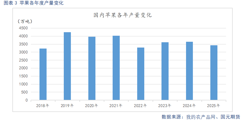 近几年,全国水果种植面积逐年增加,据国家统计局数据显示,截止2024年,全国水果产量达3.4亿吨,同比增幅3.98%。其中,作为我国种植面积最大、增幅最快、产量最高的水果品类,2025年产量预估在6500万吨以上。并且随着社会发展水平的提高,居民对水果品类的选择日趋多样化,稀释了苹果单品消费的能力。