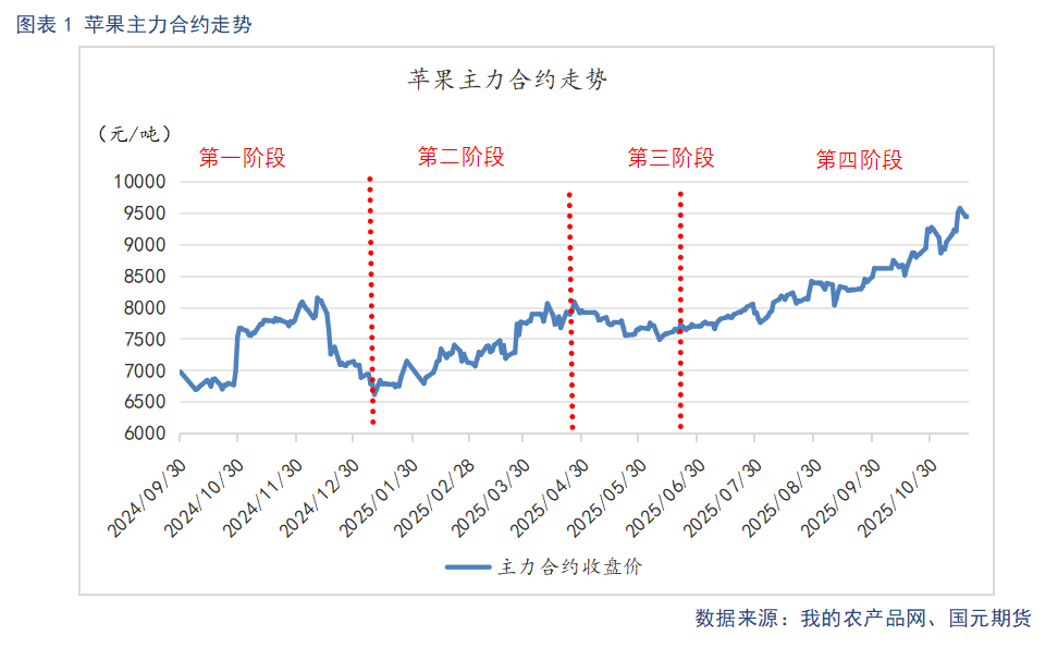 第四阶段:2025年7月至今,行情持续走强,突破9500元/吨一线。7月夏季时令水果开始集中供应,苹果处于淡季,走货缓慢,但冷库剩余货源不多,销售压力不大,冷库果价格整体持稳。早熟品种陆续上市,由于冷库果余货不多,叠加消费者尝鲜心理,开秤价高于去年同期,并偏强运行。到了9月,已临近新季晚熟上市,市场焦点转移到晚熟产量、质量上。受陕西产区生长期遭遇的大风沙尘和高温干旱影响,陕西新季果商品率预期不佳,并在早熟品种嘎啦上得到验证,市场担忧情绪升温,受早熟价格偏强以及晚熟质量预期不佳影响,新果上市前,盘面已进入上行通道。新季晚熟在10月陆续上市,由于连阴雨影响,上色进度受阻,果面质量也遭受影响,新一轮的不利气候,使得商品率偏低问题超出此前预期。并且收购、入库工作整体推迟,好货供应偏紧的现状推高收购价,入库量也低于去年同期,供应端偏紧预期支撑盘面向上突破9500元/吨一线。其中受到前期入库阶段的降雨影响,市场对后续储存质量存有担忧情绪,远月估值显著提升。
