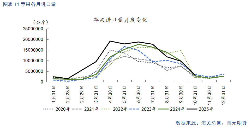 据海关总署统计,2025年1-10月,我国苹果累计进口量为11.11万吨,同比增长19.2%。由于我国苹果产量占世界总产量50%以上,供给充足,自身能满足国内需求,因此鲜苹果总体进口规模较小,每年进口量占总产量的0.1-0.2%左右,主要以满足消费者口味多样性为主,虽然进口规模呈现增长势头,但基数偏小,对供需整体影响不大。
