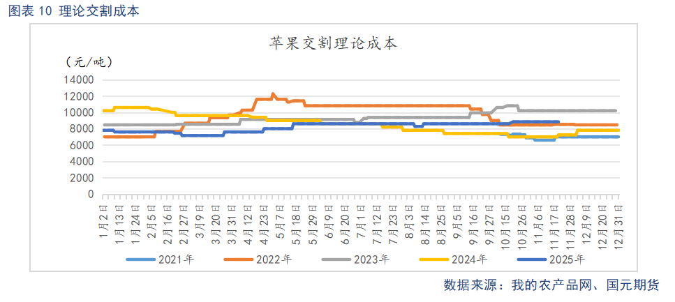 苹果交割细则进行调整,本次调整主要围绕"降本增效、贴近现货"核心,通过扩大交割单位、细化质量标准和升贴水机制、统一包装规范,使期货规则与苹果产业实际更加契合,为产业提供了更可靠的价格参考,进一步降低了交割成本。截止2025年11月,理论交割成本为8840元/吨,25/26果季收购价高于去年同期,加之商品率匹敌,理论交割成本较2024年同期上升1840元/吨。理论交割成本=折算价+交割费+增值税+利息,折算价里包含了收购成本、成品率、三级果价、代办费、仓储费、分拣费等费用。在实际交割中,收购成本、利息、成品率、分拣费用存在差异。是否是自有仓库,仓储成本也有不同。因此实际成本于理论成本存有一定差异,预估平均在9000元/吨附近。