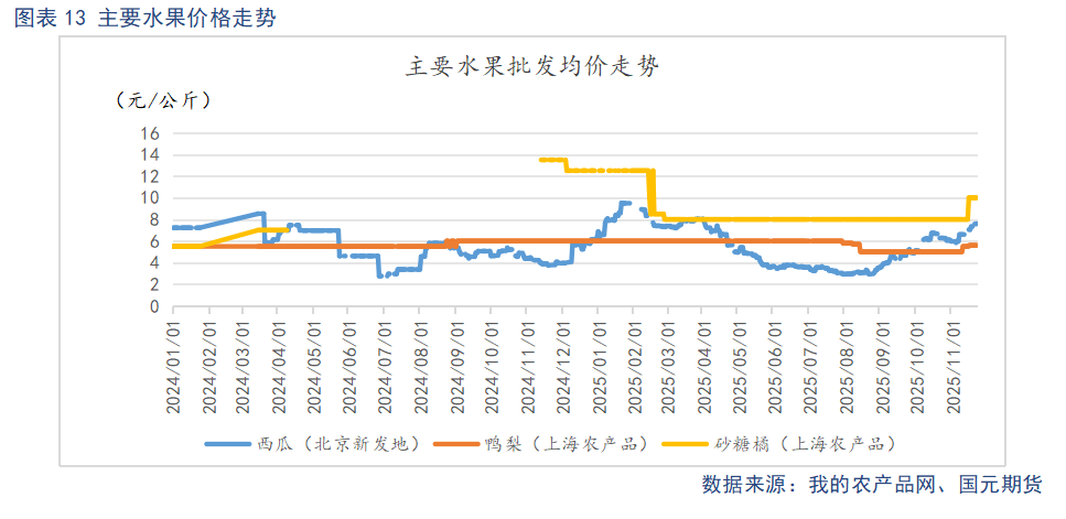苹果受时令水果的替代性较强,如秋冬季的梨、柑橘,夏季的瓜果类。其中柑橘类、梨的生长周期与苹果相近,和苹果的替代关系最强。一般来说,梨的成熟期在每年的8月至10月之间,柑橘上市时间在11月-次年3月。梨、柑橘的销售压力集中农历春节前后,与苹果的重要消费期重叠。截至11月21日,上海农产品市场鸭梨批发均价为5.6元/公斤,较去年同期下跌0.4元/公斤。上海农产品市场砂糖橘批发均价为10元/公斤,较去年同期下跌3.5元/公斤。受今年北方气候的不利影响,梨类遇到类似苹果的情况,好货供应紧张,不过在管理技术提升的背景下,整体产量依然充裕。而柑橘类作为我国产量第一的水果品类,今年延续增长势头。柑橘、梨类的上市期与苹果重合,且同为大宗水果,量大价低,对苹果消费形成明显替代效应。