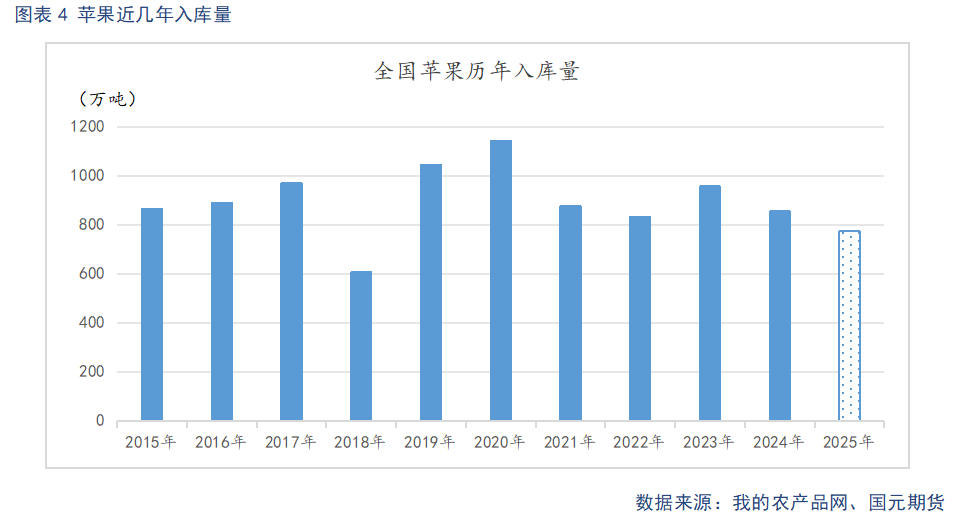 对比产量,本季最突出的问题在于商品率偏低,气候扰动贯穿本季生长期和收购期:大风沙尘影响授粉,后续又遭遇高温干旱,导致果个普遍偏小。9月底至10月中旬主产区的连阴雨,影响新果上色,下树时间延迟,阻碍了收购及入库进度的同时,上色、水烂、疫腐病问题进一步加剧了商品率偏低的情况。导致好货供应紧张,推高收购价格,“高价低质”“好货难寻”,使得客商收购量低于去年同期。据我的农产品网统计,截止2025年11月19日,全国主产区苹果冷库库存为773.16万吨,较2024年同期下降9.55%,处于近十年历史第二低水平,仅高于遭遇严重倒春寒,导致大规模减产的2018年。叠加库内货源质量偏差,库存结构呈现“量质双低”的特点。作为季产季销的品种,当季库存量基本反映后续销售期的供给量,本季供应偏紧的格局为盘面下方提供坚实支撑。