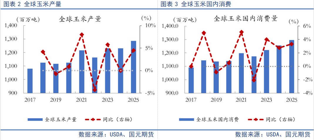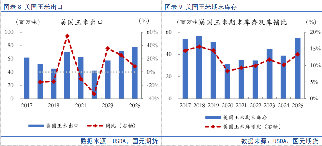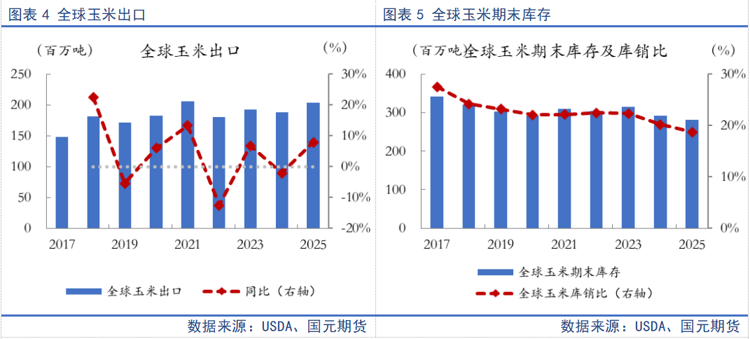 整体而言,2025年全球玉米供需虽实现供给扩张,但期末库存较上年度减少2518万吨、库销比同比降2.92个百分点,强化了紧平衡格局;主要产国供应结构分化增加了市场波动风险,而中国库存去化、进口收缩的组合,进一步凸显了区域供需的结构性偏紧特征。