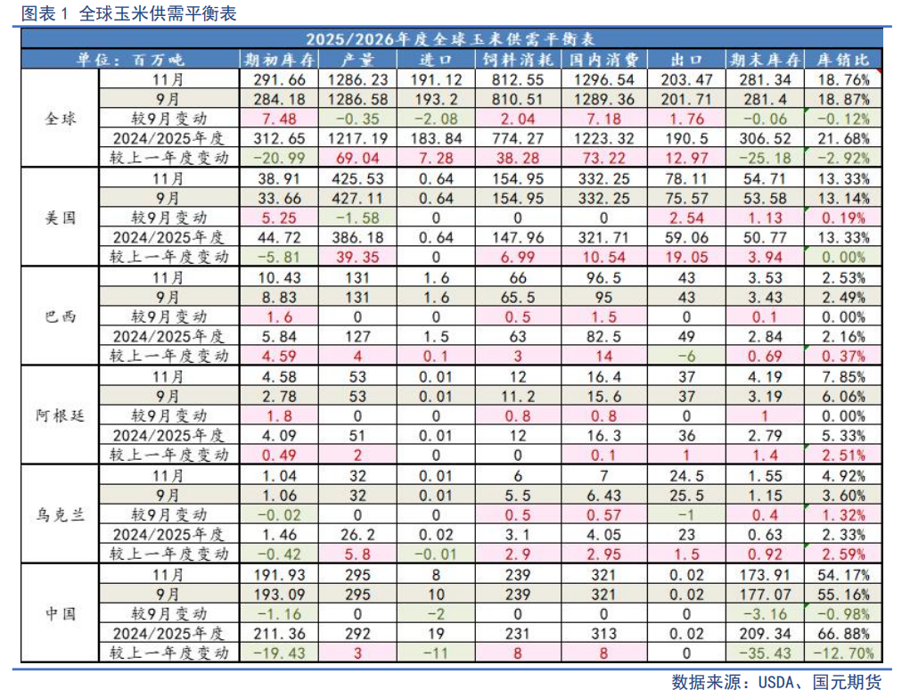 根据USDA11月供需数据显示,2025/2026年度全球玉米供需呈现“供给温和扩张、需求同步抬升,库存与库销比双降”的紧平衡格局。从全球层面看,期初库存为2.9亿吨,较9月数据增加7418万吨;产量为12.86亿吨,较2024/2025年度增长6904万吨;进口为1.91亿吨,较2024/2025年度增加728万吨。供给端虽有扩张,但期初库存较上年度减少2099万吨,一定程度削弱了供给弹性。需求端饲料消耗为8.12亿吨,较2024/2025年度增加3828万吨;国内消费为12.97亿吨,较2024/2025年度增加7322万吨;出口为2.03亿吨,较2024/2025年度增加1297万吨,需求增速与供给扩张基本匹配。最终推动期末库存降至2.81亿吨,较上年度减少2518万吨;库销比为18.76%,同比下降2.92个百分点,全球供需紧平衡特征较上年度有所凸显。