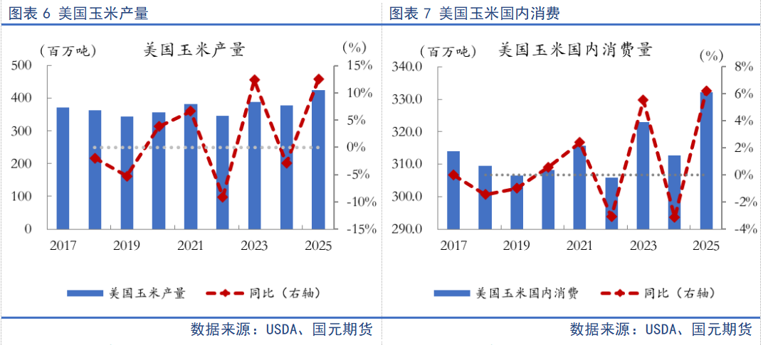 单产方面,11月报告显示2025年美玉米单产为186.0蒲式耳/英亩,虽较9月预估的186.7蒲式耳微降0.7蒲式耳,但同比仍增长3.7%,且高于市场预期的184.0蒲式耳/英亩。叠加创纪录的种植面积,最终美玉米产量达167.52亿蒲式耳(约4.26亿吨),同比增长12.5%,供给端扩容幅度显著。
