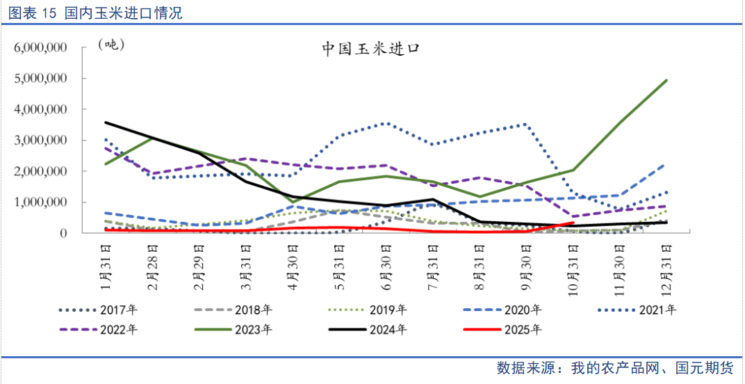 海关数据显示,2025年9月我国进口玉米5.7万吨,同比减少25.7万吨,减幅82%;玉米进口受配额管制,并且受对美国进口玉米加征关税措施影响,玉米进口量维持在近年来低位。