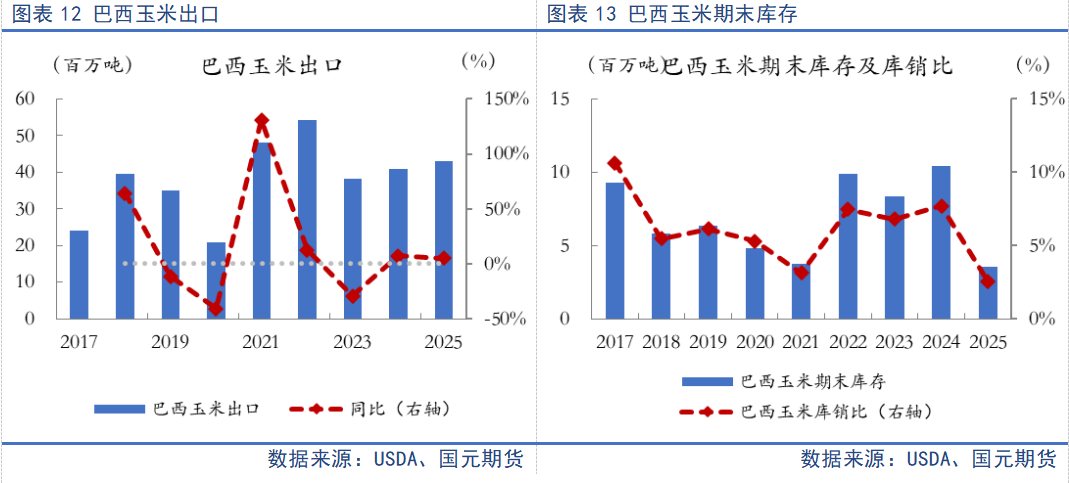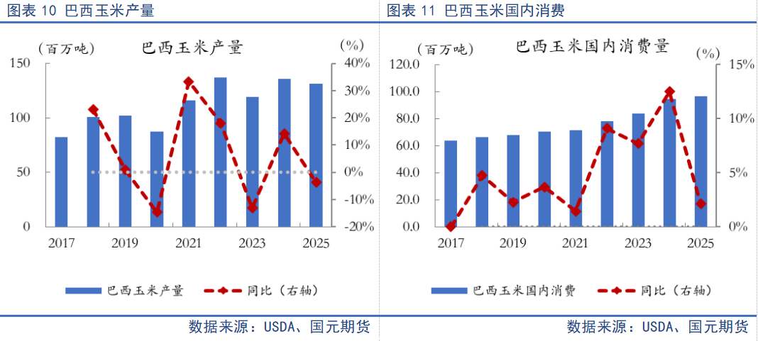 结合USDA11月供需报告、CONAB(巴西国家商品供应公司)以及StoneX报告,2025年巴西玉米呈现“分季种植分化、供给增量有限、需求外溢显著”的紧平衡供需结构,产量延续增加态势,出口量虽有所下降但仍保持较高水平,国内消费和压榨需求增加,同时保持了相对较高的库存水平。根据USDA11月供需平衡报告显示,2025/26年度巴西产量为1.31亿吨,较上年度增长400万吨;出口为4300万吨,较上年度减少600万吨。
