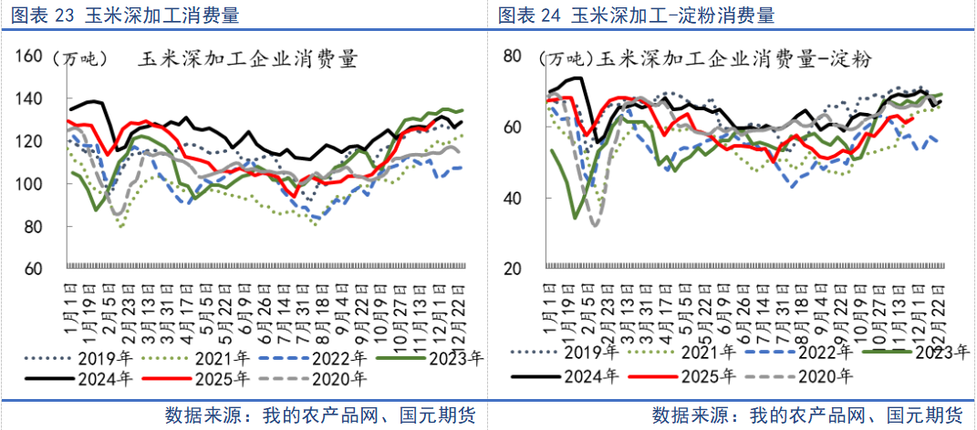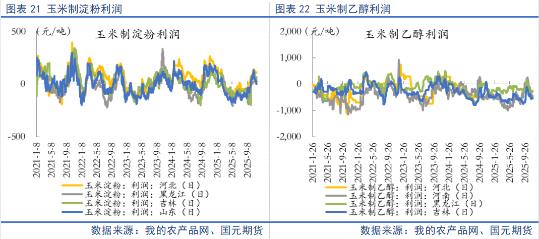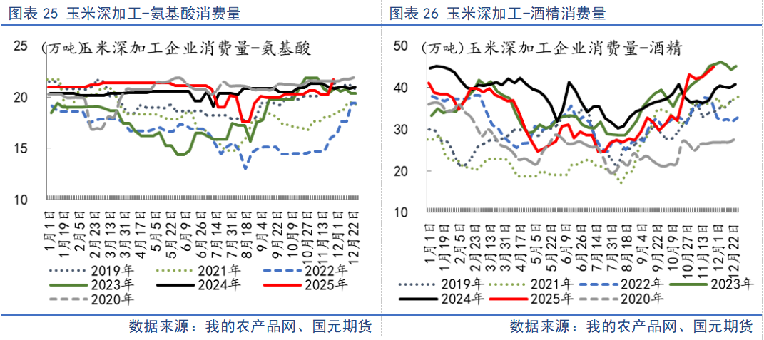 2025/26 年度国内玉米淀粉、氨基酸等产品加工产能继续扩张,总加工产能处于历史高位,带动玉米工业消费增加。随着新季玉米上市,价格出现明显下降,淀粉及其下游产品竞争力增强,加工利润好转,开工率回升。2025年玉米产量稳中有增,原料供应充足且成本波动可控,深加工企业开工率维持在合理区间,避免了原料短缺对生产的制约。据我的农产品网数据,2025年我国玉米制淀粉利润经历先抑后扬走势,三季度受玉米价格回调,玉米淀粉利润一度走高,年底回落至成本线附近。玉米制乙醇利润年内维持低迷。据我的农产品网数据显示,截至11月28日,我国2025年玉米深加工累计消费量5442.43万吨,玉米制淀粉消费量2848.62万吨,玉米制酒精消费量1603.73万吨,玉米制氨基酸消费量990.08万吨。